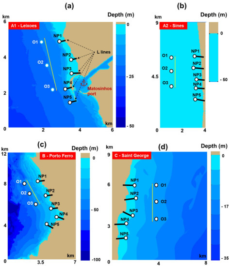 Figure 2 illustrates the case studies considered. For each target area, a line of 3 km in length was considered, aiming to replicate the influence of a generic marine energy farm. A 2 km distance between the marine energy farm and the shoreline was considered, while the orientation of the farm was made according to the particularity of each target area.
