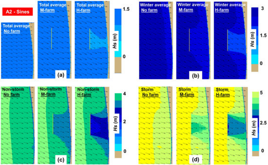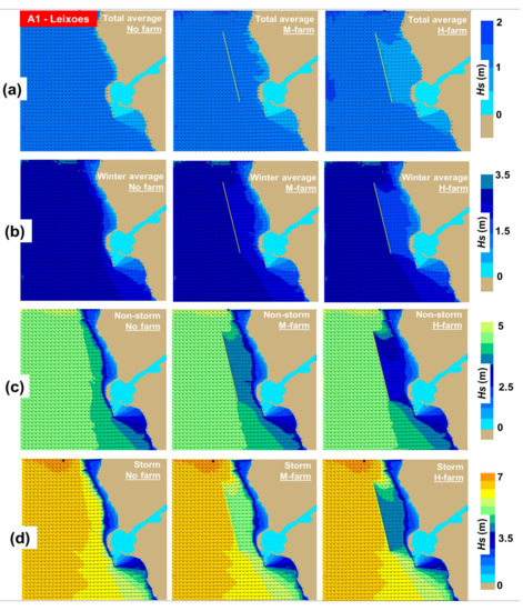 In order to provide a complete picture of the influence of an energy farm, two case studies were evaluated, as can be noticed from Table 3. The first one involved a realistic scenario where the wave farm was defined by a moderate absorption (denoted with M-farm) considering an absorption percentage of only 20% of the incoming waves. The other case study was related to a high absorption scenario (denoted with H-farm) and involved absorption of almost 40% of the waves, this being the case of a wave farm defined by several lines of WECs.