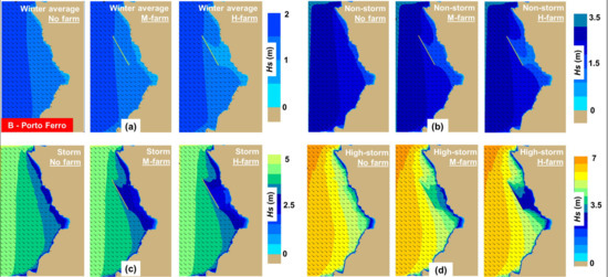 Going from the North Atlantic Ocean to the Mediterranean Sea, in Figure 5 is presented the western part of the island of Sardinia, where a generic marine energy farm was considered north of the Porto Ferro inlet. The offshore points located in front of the marine energy farm indicate Hs values of 1.35 m—winter average, 2.4 m—non-storm, 3.55 m—storm or 5 m—high-storm, respectively. For the scenario winter average, the presence of a high absorption wave farm is reflected by a shielding effect that will keep the wave heights below 1 m. A similar pattern is noticed for the rest of the case studies, with the mention that for the high absorption scenario, an additional wave field occurs near the shoreline area. From the analysis of the spatial maps, we see that the wave farm has no impact on the wave conditions encountered near the Porto Ferro inlet (point NP4). Nevertheless, by looking at the values of the significant wave heights illustrated in Table 6a, we notice that the significant wave height presents some changes. For this point, the Hs values decrease from 1.09 (winter average/no farm) to 1.01 m (winter average/H-farm) or from 3.66 (high-storm/no farm) to 3.57 m (high storm/H-farm), respectively.