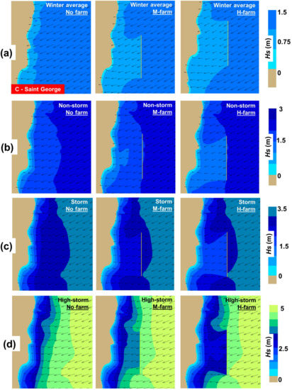 Saint George case study—variation of the significant wave height and mean wave direction corresponding to: (a) winter average; (b) non-storm; (c) storm; (d) high-storm.