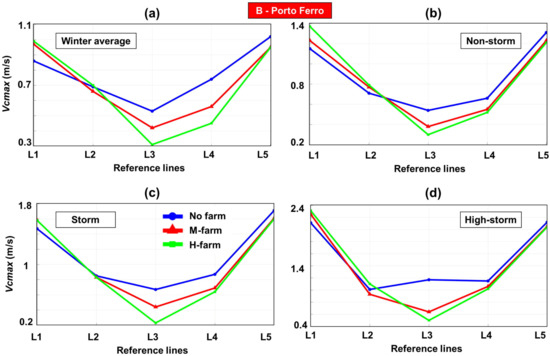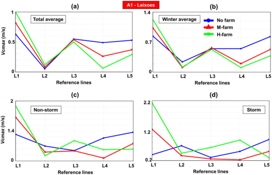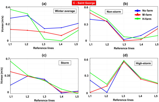 Saint George study—maximum current velocity (Vcmax in m/s) estimated along the five reference lines considered (L1–L5). The results are indicated for: (a) winter average; (b) non-storm; (c) storm; (d) high-storm.