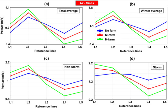 Sines study—maximum current velocity (Vcmax in m/s) estimated along the five reference lines considered (L1–L5). The results are indicated for: (a) total average; (b) winter average; (c) non-storm; (d) storm.