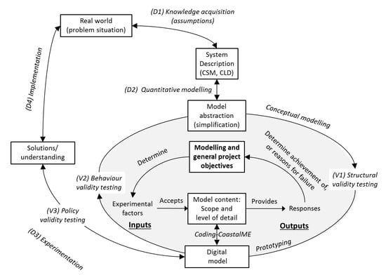 Within the wider context of a simulation study [8], Figure 1 illustrates an idealised workflow for the simulation of mesoscale coastal geomorphological change to inform strategic coastal management and facilitate project approval. This includes seven main activities, four of which are development-related and three of which are concerned with the validation of the model. The four development activities are: (D1) knowledge acquisition; (D2) quantitative modelling (which integrates conceptual modelling, prototyping and model coding); (D3) experimentation, and; (D4) implementation. The outcome of each process is, respectively, a system description (i.e., Coastal System Maps (CSM) and Causal Loop Diagrams (CLD) [9,10]), a digital model, solutions to the problem modelled and/or a better understanding of the real world and improvements of the real world. The three validation activities encompass (V1) structural, (V2) behaviour and (V3) policy validity testing [11]. The outcome of each validation activity is an increase/decrease in the confidence level regarding the model scope and level of detail, model behaviour and the implications of the modelling results for policy, respectively. The double arrows in Figure 1 reflect the iterative nature of the process and the circular flow of these four main activities illustrates the potential to repeat the process of improvement through multiple simulations. In this work, our interest is on model content, in particular ensuring that the model has a sufficient level of detail for the behaviour validity testing (V2) and the policy validity testing (V3). It is useful to distinguish between the realistic and useful detail that can be included in relation to topography and sedimentology and the quite abstract representations of the processes governing geomorphological development that often underpin such mesoscale simulations.
