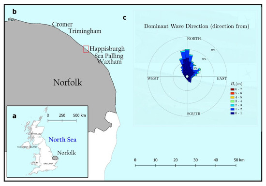 Study location: (a) Norfolk (grey polygon) on the east coast of England; (b) study site location (red rectangle) and nearby locations mentioned in this paper; (c) wave rose for Happisburgh created using downscaled data (1961–2016) from the Climate Projections 2009. Available at: http://ukclimateprojections.defra.gov.uk/ (accessed 30 Nov 2019).