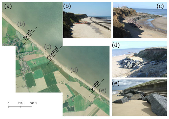 Human interventions along the Happisburgh coast; (a) aerial image from 2006 showing the transect locations (source: Aerial photography© UKP/Getmapping Licence No. UKP2006/01); (b) wooden revetments, steel sheet pile and groins in the northern part; (c) & (d) rock armouring at north-end and south-end of the embayment; (e) rock armouring in front of the seawall at the southern part.