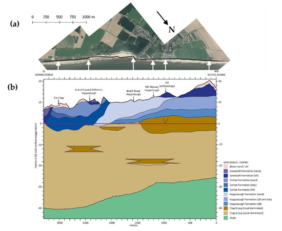 The cliffs at the study site have slopes slightly lower than and within the range of their peak angle of friction (i.e., 24 to 32 degrees [28]) and range in height from 6 m to 20 m above Ordnance Datum (OD) (Figure 4). They are composed of a sequence dominated by glacigenic sediments including multiple diamictons (admixtures of poorly-sorted clay, sand and gravel), separated by beds of stratified silt, clay and sand [29,30,31]. These units were deposited during several major incursions of glacier ice into the region during the Middle Pleistocene [32]. The basal unit that crops-out discontinuously at the base of the cliffs is the Crag Group (Early to early Middle Pleistocene age), which is typically obscured by modern beach material but is periodically exposed following storms [25]. The Crag Group consists of stratified sands and clays interpreted as shallow marine to inter-tidal in origin and punctuated by occasional elongated lenticular bodies of fluvial muds [33,34]. The Crag Group rests unconformably on an undulating upper surface of Chalk bedrock (Cretaceous age). Chalk bedrock depths increase from about −25 mOD at the northern end to −40 mOD at the southern end. The large potential stock of sand and gravel at the shore platform present in the Crag Group suggest that the beaches at Happisburgh might not be sediment starved, providing that the waves and currents have enough energy to erode and transport this material towards the coast.