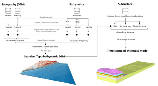 General workflow to create a 3D thickness model from different databases including topo-bathymetric and subsurface consolidated and unconsolidated sediment fractions.