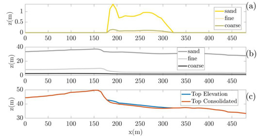 Visualisation of unconsolidated (a) and consolidated (b) sediment fractions (fine, sand and coarse) along Happisburgh South transect. Top elevations of the consolidated and total (i.e., consolidated + unconsolidated) elevation are shown in panel (c).