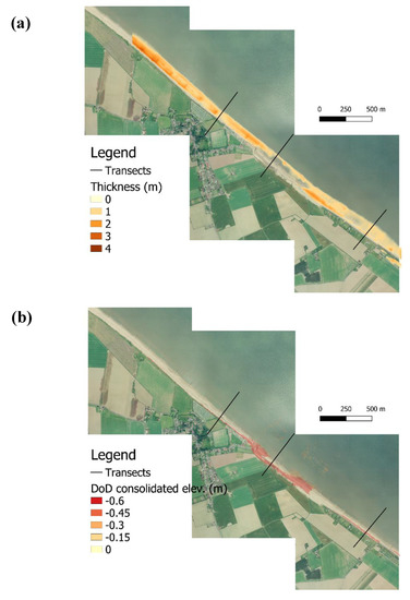 Figure 9a shows the beach deposit thickness, obtained from the difference between the topographic elevation and the consolidated platform top elevation, overlaid on an aerial image. Beach deposit thickness varies across and along the shoreline, ranging from 4 m in the north, minimal to non-existent along the undefended central section, and 2–3 m in the southern sector. As expected, the simulated lowering of the consolidated platform (Figure 9b) is largest at places where the beach deposits thickness is least and cannot offer protection. These differences in beach thickness, combined with the different defence structures close to each transect, have an appreciable effect on the simulated elevation changes (Figure 10, Figure 11 and Figure 12).