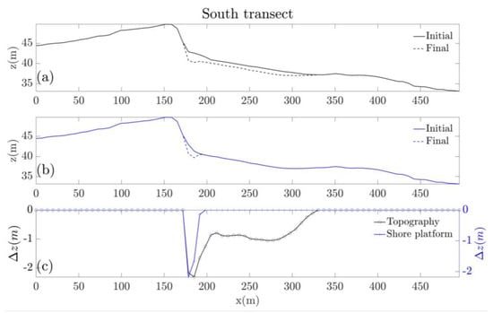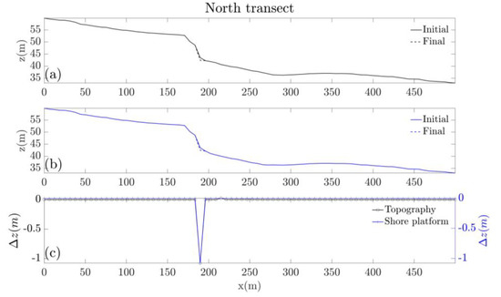 Figure 12 shows the equivalent results along the South transect, where the beach thickness is greater (1–2 m). Cliff toe horizontal location remains unchanged because this section is protected by a sea-wall. Topographic lowering is no longer restricted to the proximity of the cliff toe and is appreciable, with an average value of −0.8 m, along the entire active transect with a maximum vertical erosion of −2 m close to the sea-wall toe. However, lowering of the consolidated platform is still constrained to the region nearby the sea-wall toe where it reaches a maximum of 2 m. This implies that the topographic lowering is mostly due to vertical erosion of the consolidated platform near the sea-wall toe while, seawards, the lowering is due to beach material being lost due to longshore sediment transport gradient. Even here, the beach appears to remain thick enough to protect the underlying consolidated platform from lowering.