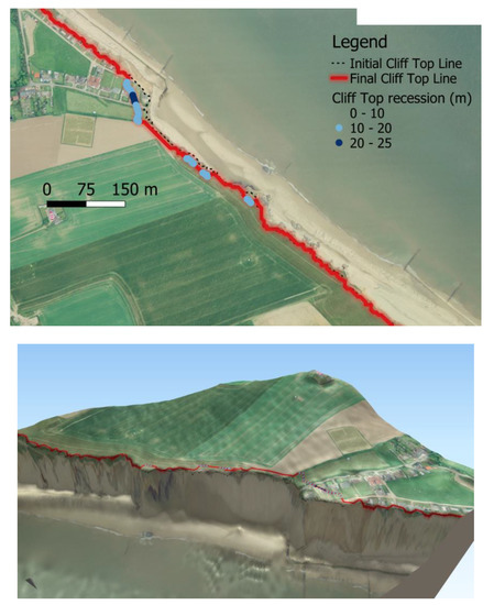 Figure 13 shows the initial and final simulated cliff top lines along with a Digital Elevation Model (DEM) created from the topographic elevation. Cliff top lines were extracted using the CliffMetric automatic delineation algorithm proposed by Payo et al. (2015). Cliff top and toe location points have been converted into lines and the shortest distance between the final and initial cliff top points used as an indication of cliff retreat. A maximum cliff top retreat of 30 m is obtained in the north of the non-defended coastal section, while the cliff top remains unchanged (i.e., differences smaller than one diagonal cell length or 7 m) for the defended sections. The lines are plotted on a 2D view of the study area and 3D view with aerial imagery as background to facilitate geolocation.