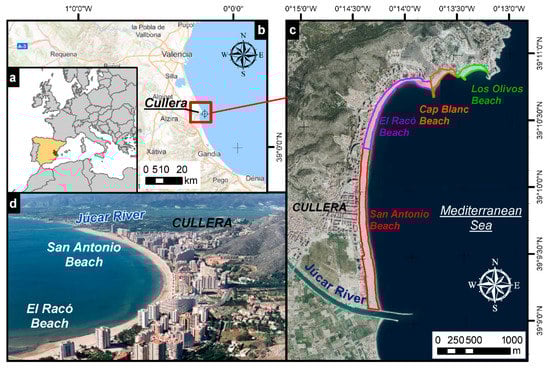 This study was conducted in the municipality of Cullera, specifically in the so-called Bay of Cullera, which is located between the Cape of Cullera and the mouth of the Júcar River. Cullera is a municipality specially dedicated to the tourist offer with a population of 24,121 inhabitants [], increasing it to 150,000 inhabitants in high season [].