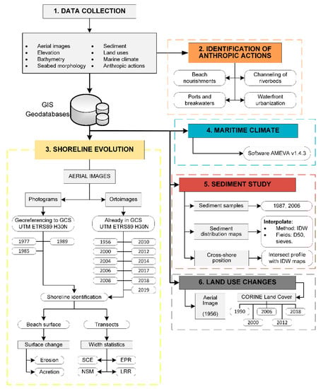 One of the elements that can explain the coastal processes is the sediment, due to the relation that exists between their size, specific weight and the energy of the waves []. Therefore, it is necessary to study the evolution of the shoreline, and the transport and spatial and temporal distribution of sediments []. In this sense, geographic information systems (GIS), widely used in coastal risk assessment [,], or the evolution of cliff and seabed topography, are very useful [,]. Among the studies conducted, those of Rosskopf et al. [] investigated the possible influence of natural and anthropogenic factors, especially climate variability and coastal defence structures designed on the coast of Molise. These authors concluded that the observed differences in rates of coastal change over time on the decadal to interannual scale and did not find an answer in the analysis of available data on marine meteorological conditions and indices of climate variability. Using the DSAS extension of ArcGIS software evidenced the impact of rigid structures, Molina et al. [] found that accretion was essentially observed updrift of ports and groins and in correspondence of protection structures, especially of breakwaters. Erosion classes were observed downdrift of ports and groins and in correspondence of revetments/seawalls, and at largest river deltas, and “stability” was observed at pocket beaches and coastal areas locally stabilized by protection structures. Also, Di Paola, et al. [] used GIS to study coastal risk in Gran Canaria, and highlighted the need for the relevant public administrations to develop a strategic approach to coastal management and sustainable development that considers socio-economic values and natural resources together.