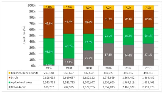 Throughout the 62 years of study, a continuous decrease in the mountain (scrub) and the agricultural area was observed (Figure 3). In 1956, a large part of the surface area was occupied by mountainous areas covered with scrub (49.6%) and areas used for agriculture (43.5%). According to this decrease, the territory was occupied by urbanized area, which grew from a small town on the beach of San Antonio that barely covered 1.9% of the area to reach 37.1% of the current area. Also noteworthy are the changes suffered by the beach area, which increased by 147,670 m2, which means increasing from 5% of the surface area in 1956 to 7% in 2018.