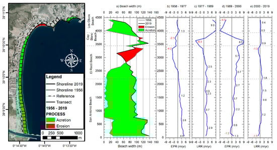 Analysing each of the beaches separately, Cap Blanc beach was the only one that remained stable throughout the study period, although it suffered significant variations between 1977–2000, with a maximum erosion rate of −6.3 m/year (1997–1989) and a maximum accretion rate of +8.5 m/year in the period 1989–2000. San Antonio beach was the one that has suffered the greatest variations above all in the period 1956–2000, in which the beach surface area increased by 192,413 m2, which, considering the length of the beach, means an average increase of 84 m in beach width. As for the other two beaches (Racó and Los Olivos), the main variations occurred between 1977 and 1992. These variations, which produced the accretion of Los Olivos beach and the erosion of Racó beach, occurred due to the construction and subsequent removal of an L-shaped breakwater for the creation of a marina, which caused a destabilisation of the whole. Both beaches have remained stable since the removal of the breakwater, with an average beach width of 70 m on Racó beach and 73 m on Los Olivos beach (Figure 5).