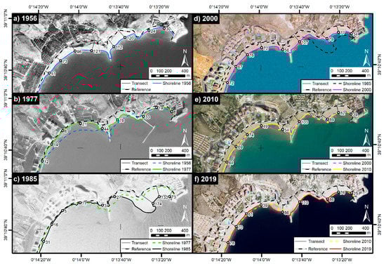 The evolution of the shoreline was studied by means of the comparative analysis of its position from aerial images from 1956 to 2019 (Figure 2) following the procedure described by Pagán et al. []. The images were downloaded from Institut Cartogràfic Valencià under CC BY 4.0 license in ECW raster format, with geographic coordinate system UTM ETRS89 H30N. The spatial resolution of the images from 1956 to 2012 is 50 cm/pixel, whereas from 2014 to 2018 is 25 cm/pixel. The georeferencing process (the assignment of coordinates to the photograms raster datasets) was carried out using ArcGIS 10.6®. The target image was the orthophoto of the year 2000. Each photogram was georeferenced identifying a series of ground control points (GCP) that link locations on the raster dataset with locations in the spatially referenced data (target data). For each raster, at least 50 GCP were used, which were spread over the entire image. Once the GCP were placed, the transformation of the raster was carried out using the adjust transformation. This transformation optimized the image for both global and local accuracy. The errors obtained were <0.25 m root mean square (RMS). Since all the aerial images were collected in summer and the state of the sea was relatively calm, the methodology provided optimal results for the manual vectorization of the shoreline at a scale of 1:1000.