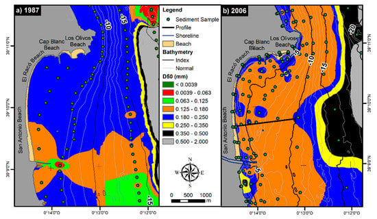 The analysis of sediment distribution showed a significant decrease in median sediment size across the bay (Figure 6). Thus, in 1987, there was a predominance of fine sand (0.180–0.250 mm), except for the area around the mouth of the Júcar river, where there was a significant accumulation of silt (0.02–0.002 mm) and clay (<0.002 mm). However, in 2006, the distribution was much more homogeneous, with fine sand along the whole bay with some occasional sources of slightly thicker sand (0.250–0.350 mm). These areas were mainly found around Los Olivos beach and next to the mouth of the Júcar River. By analysing the different proportions of sediment sizes in depth (Figure 7), it has been found that the smaller sizes accumulate outside the depth of closure (≈5.69 m, obtained according to Aragonés, et al. []) irregularly, while the larger sizes (0.180 mm and 0.250 mm) show a clear tendency to remain in the first 4–5 m of the profile and not change position. A clear example can be found at Racó beach, where the predominant sizes near the shore are those of the larger sediments.