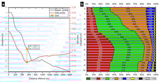 (a) Beach profile and median sediment size (D50) profile with depth of closure (DoC) marked. (b) Grain size distribution with depth.