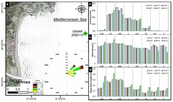 The analysis of the maritime climate was conducted using data from SIMAR Node 2082110 (0.17° W, 39.17° N). The data from this point were treated through the AMEVA v1.4.3 software [], obtaining the wave height and its corresponding periods, directions and probabilities of occurrence for each of the study periods. The swell in the area is conditioned by the Cape of Cullera to the north and the mouth of the Júcar River to the south.