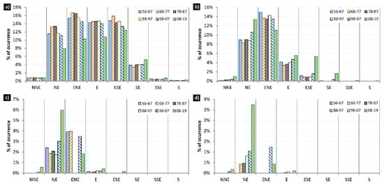 As far as the waves are concerned, as shown in Figure 8, the most common directions were those between the NE and the ESE (both inclusive), while the waves from the NNE, SE, SSE and S were practically insignificant, with an average accumulated value of 6.5%. The most common wave heights were those below 1 m with periods between 5–6 s, which indicates that this is an area with relatively calm coastal dynamics throughout the year. On average, 56% of the waves were less than 0.5-m high, and 29.2% were between 0.5-m and 1-m high (Figure 9). The probability of occurrence of wave height and direction was practically stable during the periods analysed. However, the last period (2008–2019) stands out, in which a variation of the probability of occurrence was observed, mainly: (i) The NE waves increased 6.4% concerning the average of the rest of the periods. There was a decrease in the wave heights below 0.5 m, but heights between 0.5 m and 1.5 m increased. (ii) Waves from the ENE decreased by 8.7% to the average, mainly due to the decrease in wave heights below 1 m. (iii) The rest of the directions suffered slight variations below 2%.