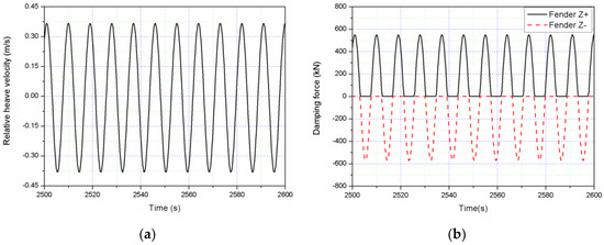 Regular wave sea conditions with H = 2 m and T = 9 s are simulated in the time domain (Figure 10) without wind excitation loads [28]. In Figure 10a, the maximum relative heave velocity of the combined structure is smaller than 0.375 m/s while the minimum absolute value is larger than 0.375 m/s, which is an explanation why the peaks of produced power (Figure 10c) are not obtaining same values (Equation (23)). In Figure 10b, the PTO damping force induced by fenders in AQWA mode is presented. The phase of the forces is similar with relative heave, which means the damping forces are negative or positive when the WEC is up or down. Moreover, the capture width ratio, which is used to evaluate the WEC capability of absorbed wave power, is calculated by Equations (26) and (27) [29,30] as follows: