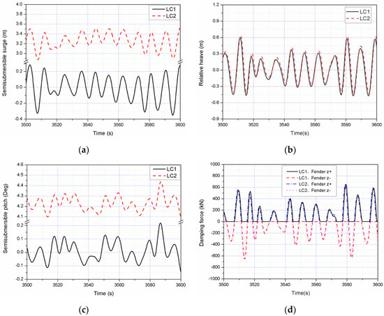 Comparisons of the time series of the responses for LC1 and LC2 of: (a) semisubmersible surge; (b) relative heave; (c) semisubmersible pitch; (d) damping force; (e) produced power.