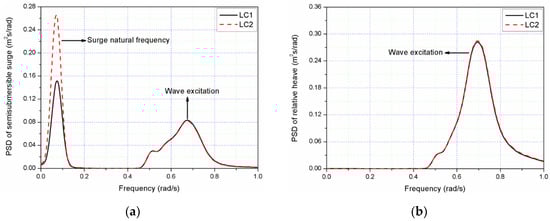 Moreover, in Figure 18, PSD of motion responses (surge, relative heave and pitch) and dynamic responses (horizontal contact force, PTO damping force, mooring line 1 tension and mooring line 2 tension) of the combined structure with considering hydrodynamic coupling have similar trend compared with those without considering hydrodynamic coupling. For surge motion (Figure 18a), the surge resonant motion is dominant at 0.073 rad/s, which is the surge natural frequency, followed by the wave frequency response in the range 0.400 rad/s to 0.800 rad/s. A large decrease of the response at the surge frequency exhibits if the hydrodynamic coupling is considered. Similar as LC1 and LC2 (Figure 16b), the most significant contribution to the relative heave motion comes from the wave frequency (Figure 18b). Considering hydrodynamic coupling will give a small increase in heave motion response near wave frequency, which is similar as in surge motion response. This enhancement of the surge and pitch responses near wave frequency can also be identified with wave period of 10 s in Figure 9a,b. For pitch motion (Figure 18c), the wave frequency response and pitch resonant response are very comparable, meanwhile, surge resonance response also visible in this motion. The pitch response considering hydrodynamic coupling at the surge natural frequency and wave frequency is larger than that without considering hydrodynamic coupling, opposite influence can be identified at pitch natural frequency. Figure 18d,e shows that the wave frequency responses are also dominant in the same range for horizontal contact force and damping force and the hydrodynamic coupling will contribute the increase of the response in the wave frequency range. For mooring line tension force (Figure 18g,h), PSD of mooring line 1 tension with surge resonance frequency occupy a dominant position compared with the value of mooring line 2 tension. Due to the hydrodynamic coupling effect, both responses of mooring line 1 and line 2 reduce at the surge.