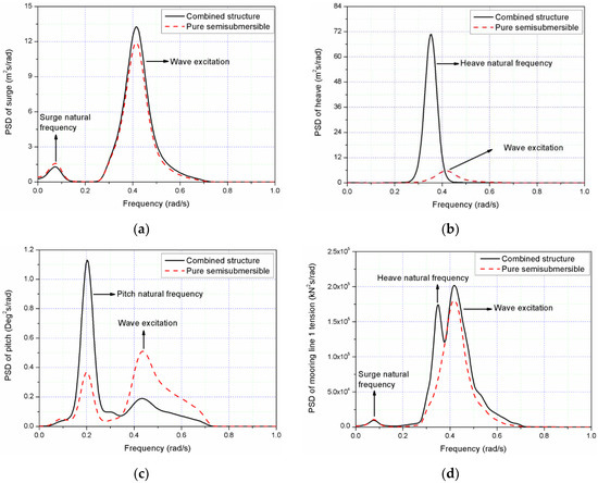 Figure 21 presents the PSD of the motion response and mooring line forces of the combined structure and pure semisubmersible platform under the extreme sea condition LC4. PSD of surge of the combined structure have same trends compared with pure semisubmersible platform and the response is dominant by the wave frequency (Figure 21a). For heave motion (Figure 21b), the response of pure semisubmersible is dominated by the wave frequency. However, for the combined structure, the response around the frequency of 0.35 rad/s is significantly larger because this frequency is the heave natural frequency of the combined structure and is near to the range of wave frequency. The shifting of the heave natural frequency of the combined structure from the pure semisubmersible (0.254 rad/s) is due to the attachment of the WEC to the semisubmersible. The surge resonant motion of the combined structure (Figure 21c) is dominant at 0.21 rad/s, which is the pitch natural frequency, followed by the wave frequency response. But the surge motion of the pure semisubmersible is dominated by the wave frequency response. Figure 21d,e shows that PSD of mooring line 1 tension and mooring line 2 tension of the combined structure are not always identical with only pure semisubmersible platform in high peak frequency region, which is caused by the coupling effect of heave resonance and incident wave for the combined structure. The most significant contribution to the mooring line 1 tension for both the combined structure and the semisubmersible platform comes from the wave frequency range. A clear peak response from the heave natural frequency for the combined structure could be identified for mooring line 1 tension. For mooring line 2 (Figure 21e), the most significant contribution to the mooring line tension for the pure semisubmersible comes from the wave frequency range from 0.300 rad/s to 0.600 rad/s, while the low-frequency response does not contribute significantly to the total response. However, for the combined structure, the heave resonance response at approximately 0.35 rad/s dominates the total response for mooring line 2.