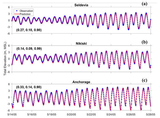 Figure 2. Time-series comparisons of model-predicted tidal elevations and National Oceanic and Atmospheric Administration (NOAA) observations at three tidal gages inside Cook Inlet, (a) Seldevia, (b) Nikiski, and (c) Anchorage. The numbers inside the brackets are root-mean-square-error (RMSE), scattered index (SI), and coefficient of determination (R2) values.