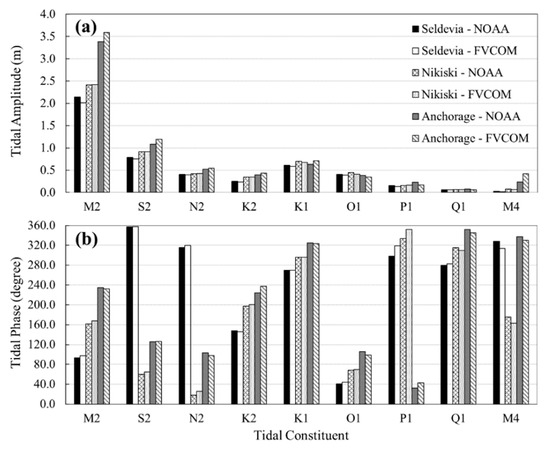 Overall, the differences between predicted and observed tidal phases are mostly on the order of a few degrees for major tidal constituents. The error statistics suggest that model-predicted tidal elevations match NOAA observations generally better than those (e.g., an average of 10% over-prediction in M2 amplitude) reported in the earlier study [17]. For example, in the earlier study [17], the amplitude difference for M2 constituent between model prediction and field observation at Nikiski tidal gage was 0.17 m (or 7% less than the observed value). In comparison, the difference in this study was reduced to 0.01 m (or 0.4%). In addition, the same trend was found for phase predictions, i.e., a 12-minute phase difference in this study vs. a 25-min difference in the earlier study [17].