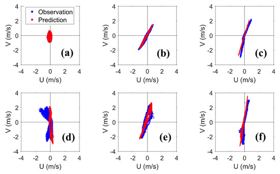 Figure 4. Scatterplots of U and V velocity components for model-predicted depth-averaged tidal currents and NOAA observations at six ADCP locations inside Cook Inlet (a) COI0514; (b) COI0511; (c) COI0508; (d) COI0501; (e) COI0502; (f) COI0503. The plots were generated from depth-averaged velocity time series for both model predictions and field observations.