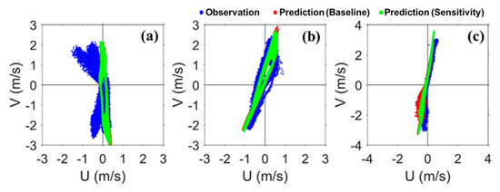 Figure 5. Scatterplots comparisons of U and V velocity components for model-predicted depth-averaged tidal currents (including both the baseline calibration run and the sensitivity test run with refined model grid) and NOAA observations at three ADCP locations in the Foreland region (a) COI0501; (b) COI0502; (c) COI0503. The plots were generated from depth-averaged velocity time series for both model predictions and field observations.