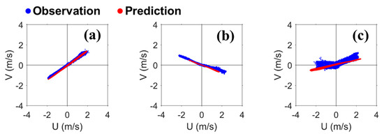 Figure 6. Scatterplots of U and V velocity components for model-predicted depth-averaged tidal currents and NOAA observations at three Year 2012 ADCP survey stations located in the upper Cook Inlet (a) COI1210; (b) COI1207; (c) COI1209. The plots were generated from depth-averaged velocity time series for both model predictions and field observations.