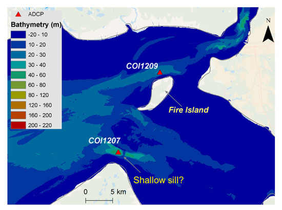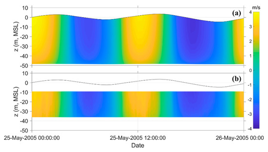 The error statistics were calculated for the east and north velocity components, respectively, to quantify the model’s performance in simulating tidal currents. The results are provided in Table 2. Overall, there is a very good correlation between model predictions and observations, i.e., 10 of 12 R2 values are greater than or equal to 0.9. As expected from the scatterplot comparisons in Figure 4, Station COI0501 has the worst correlation for the east component, as the model failed to capture the flows across the channel (east-west direction). By looking at the RMSE and SI values together, the absolute errors (RMSE) tend to be larger for the major velocity components, while the relative errors (SI) are comparably smaller at most stations. For example, at Station COI0503, where the north-south velocity is the major velocity component, the corresponding RMSE is bigger than that of the east-west component. In contrast, the SI shows the exact opposite result. This suggests that the model tends to simulate velocity better in the main flow directions. Depending on the location of the station, the RMSE can vary from 0.07 m/s to as big as 0.31 m/s, but most RMSEs are under 0.2 m/s.