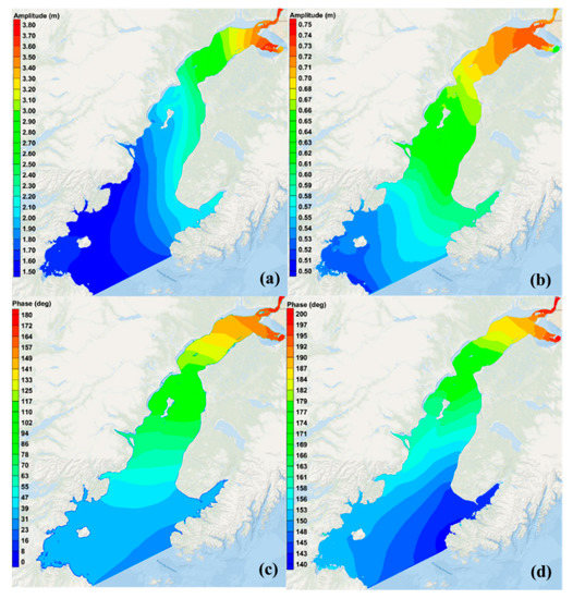 Figure 8. Two-dimensional distributions of tidal amplitude and phase inside Cook Inlet for the most dominant semi-diurnal (M2) and diurnal (K1) constituents (a) M2 amplitude; (b) K1 amplitude; (c) M2 phase; and (d) K1 phase.
