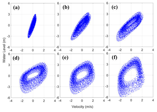 Figure 9. Tidal stage (water level vs. velocity) curves at six ADCP stations along the main axis of Cook Inlet showing the propagation of tidal wave in the system (a) COI0514; (b) COI0511; (c) COI0508; (d) COI0502; (e) COI1210; and (f) COI1209.