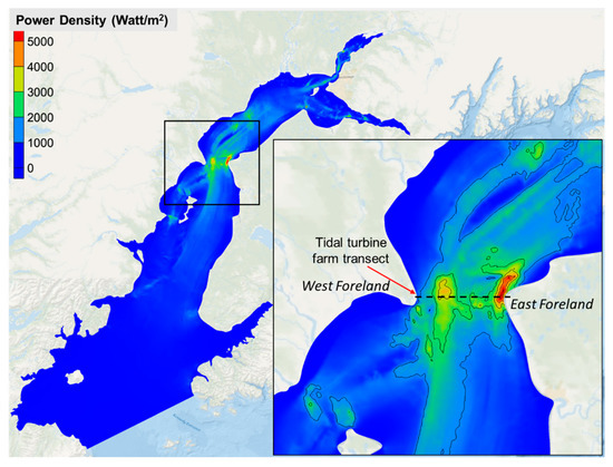 In the previous sections, we demonstrated that the hydrodynamic model was able to capture the tidal hydrodynamics in Cook Inlet. For this reason, the model simulation results were further used to characterize tidal energy resource distribution in the system. Figure 12 shows the 2-D distribution of depth-averaged tidal power density (or energy density flux) in the entire system and in the zoom-in area near Foreland. The 2-D plots suggest that the areas that have high energy density (i.e., >2000 W/m2) are mostly located in the upper Inlet. The Foreland area appears to have the most abundant tidal energy resources in the entire system, both in terms of magnitude and spatial coverage, primarily as a result of the much narrower cross section due to the presence of two forelands. More specifically, the area immediately adjacent to East Foreland has the strongest power density, which exceeds 5000 W/m2. Considering that water depth is typically on the order of 50 m in this area, it should be the top hotspot for potential tidal energy harnessing. It has a substantially larger tidal stream power density sustained over a very large area. This is consistent with previous findings by Haas et al. [17].