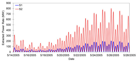 Figure 13. Time series of extracted power rate for two hypothetical tidal turbine farm scenarios (S1 and S2).