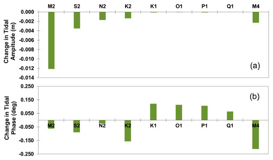Figure 14. The changes in tidal amplitude (a) and phase (b) at the NOAA tidal gage near Anchorage, Alaska, as a result of power extraction in S2.
