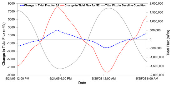 The reduction in tidal amplitude affects tidal prism in the upper inlet, which is also reflected in the tidal flux across the Foreland transect. Figure 15 shows the changes in tidal flux between two energy extraction scenarios and the baseline condition. Compared to tidal flux under the baseline condition that varies between ±1.7 × 106 m3/s across the Foreland transect, the changes in tidal flux for both energy extraction scenarios is much smaller. For instance, the maximum flow reduction typically occurs during the peak and ebb flood stages when the tidal flux is highest.