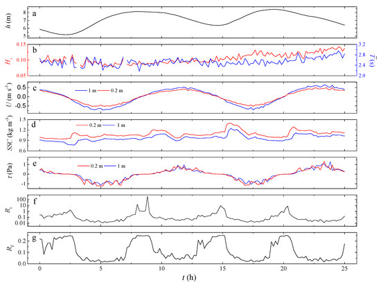 The Reynolds stress (calculated from the COV method) in the main flow direction at 0.2 and 1 m asb varied from −1.23 to 1.32 Pa and from −1.15 to 1.29 Pa, respectively, and the positive direction is the same as the current velocity. The time series of Reynolds shear stress at 0.2 m asb were slightly larger than at 1 m asb, because the Reynolds stress increase linearly downward from the surface to the seabed (Equation (9)). The gradient Richardson number and the flux Richardson number were 0.01–14.79 and 0.01–0.25, respectively, indicating pronounced sediment stratification (Figure 2). The area is characterized by sandy bed with a mean grain size of 3.9 φ, and the contents of sand, silt, and clay were 65.50%, 32.35%, and 2.15%, respectively. The threshold friction velocity at the seabed is 0.011 m s−1.