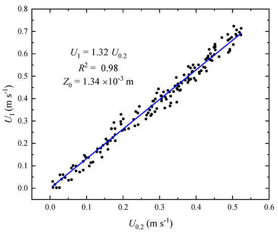 However, in this study, two ADV velocity measurements at 0.2 and 1 m asb, which both fall in the tidal-induced log layer, could be used for calculation. You [24] extended the classical Karman–Prandtl equation to estimate the bed roughness length from mean velocities measured at two levels near the seabed over a certain period (e.g., several tidal cycles). Because Z0 is primarily controlled by the bed sediment grain size and bedform geometry [25,26], Z0 was assumed to be constant for several days, for example. The Karman–Prandtl formula can be converted to: