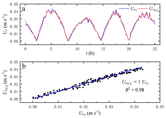Thus, both the calculated time series of Reynolds stress at 0.2 and 1 m asb in Equations (6)–(8) can be used to calculate time series of , expressed as and , respectively. Their arithmetic mean is then: