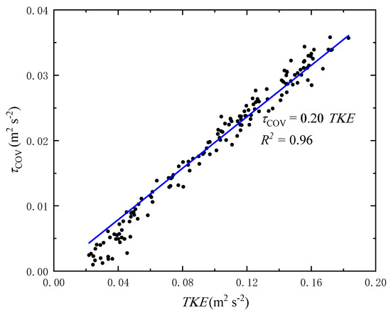 The relationship between the bottom shear stress estimated from the COV method (τCOV) and the turbulent kinetic energy (TKE) is shown in Figure 5. They are highly correlated (R2 = 0.96), and the ratio between τCOV and TKE is 0.20, which is in agreement with the value of the constant C in Equation (12) (the ratio of the shear stress estimated from the TKE method and TKE) used in this study. Therefore, the τCOV is consistent with the bottom shear stress estimated from the TKE method.
