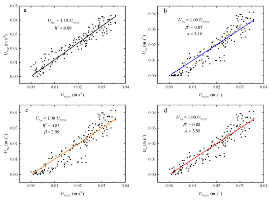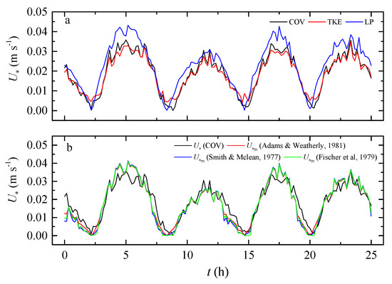 The linear fit shows that U* from the LP method is 19% larger than U* from the COV method (Figure 7a), suggesting a pronounced overestimation by the LP method. The overestimate of U* from the LP method was generally consistent with the effects of sediment stratification [6,8].