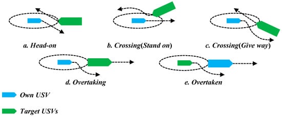 (1) Head-on: According to the Rule 14, head-on refers to when two USVs are meeting on reciprocal or nearly reciprocal courses (within 5° from bow direction to port and starboard) []. If the target USVs violate the NSD boundary of own USV, each shall alter course to starboard to avoid collision, as shown in Figure 1a.