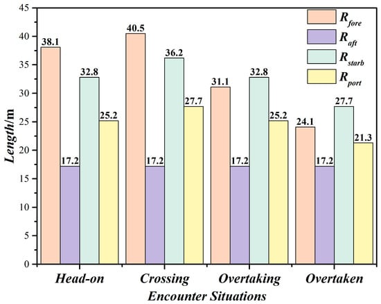 When overtaking other vessels, own USV is the give-way ship and needs to pay close attention to the movements of the stand-on vessels. Under the first angle groups, the Rfore and Rstarb in the DNSD increases to 43.3 m at the rate of 0.29 and 0.24, respectively, as shown in Figure 12a. In the second angle groups, the Raft and Rport increase to 30.1 m and 33.9 m at rate of 0.53 and 0.26, as shown in Figure 12b, in which the length of Rport is larger than Rfore. This is because when ships fulfill the requirements of the COLREGs, the majority of overtaking vessels usually overtake from the starboard of the overtaken ships. When drifting to the stand-on ships under the influence of various factors, the DNSD can expand the port and aft boundaries to make own USV avoid a collision earlier.
