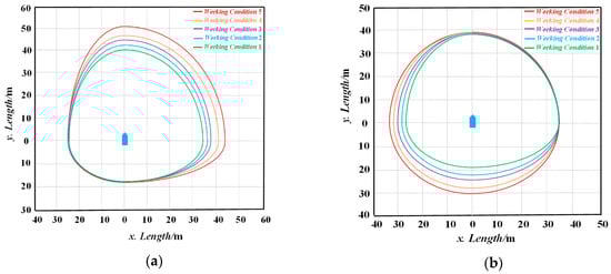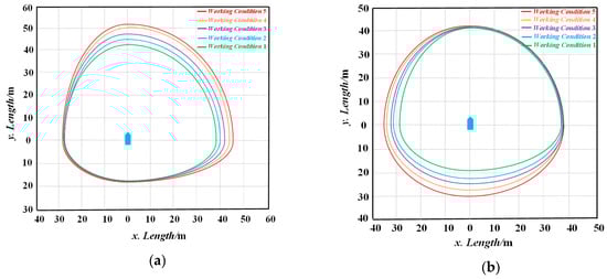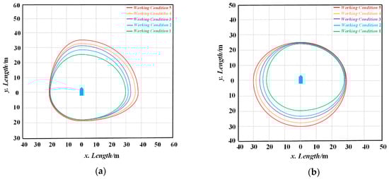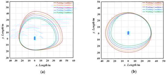 In the case of crossing, the change in the DNSD is similar to that of the head-on, and the radius length in the corresponding directions can be adjusted according to the working conditions. Under the first angle groups, the maximum values of Rfore and Rstarb are 52.7 m and 46.6 m, as shown in Figure 11a. In the other angle groups, the maximum values of Raft and Rport are 30.1 m and 36.4 m, as shown in Figure 11b.