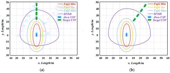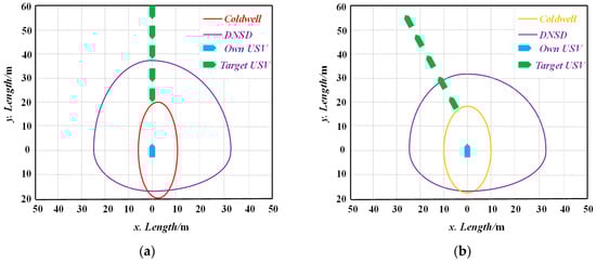 In the comparison with the Coldwell model, the target ships will infringe upon the boundary of the DNSD earlier than that of the Coldwell model, as shown in Figure 15a,b. The size of the Fujii model and Coldwell model is smaller than the DNSD in the majority of bearings; this is consistent with the conclusion of Wang et al. [] that the Fujii model and the Coldwell model are relatively small and hazardous for a ship’s collision avoidance actions. The reason is that the navigators in manned ships can judge whether there is a collision risk and take timely measures according to their own experience and real-time watch keeping. It is possible that even if the NSD has been violated, they can still rely on the navigator’s "good seamanship" to avoid collision. In addition, the aspect ratio of the Fujii model and Coldwell model are larger than that of the DNSD, which is consistent with the fact that the aspect ratio of large ships is larger than that of USVs. This will cause an insufficient length of Rstarb and Rport in the safety domain of manned ships, so it is necessary to increase the scope of the safety domain horizontally. The DNSD can make up for the existing shortage and dynamically adjust the boundary with a change in the working conditions and encounter situations, which has a good space utilization effect.