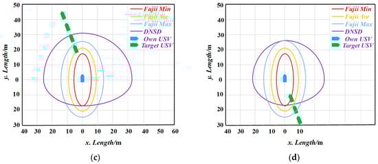 The DNSD was involved in different encounter situations. Compared with the Fujii model, in head-on, crossing and overtaking situations, the target ship will firstly violate the boundary of the DNSD, and then infringe upon the Fujii ship domain, as shown in Figure 14a–c. When the target ship is overtaking own USV, the domain of the Max and Ave models of the Fujii domain will be firstly violated, as shown in Figure 14d. This proves that during the voyage of a manned ship, the navigators may pay more attention to the threat of ships from aft directions.